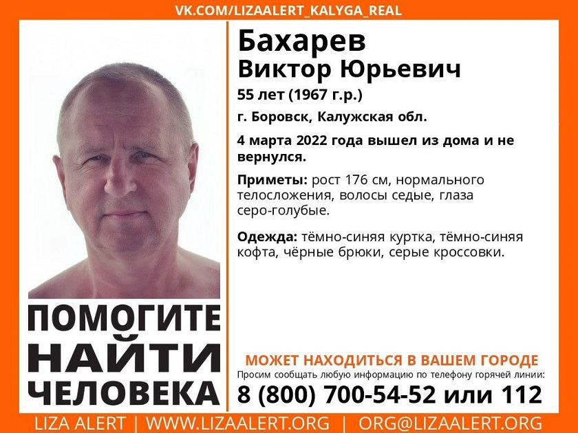 Как сообщили в отряде, Виктор Юрьевич Бахарев вышел из дома 4 марта и не вернулся. «Лиза Алерт» приводит приметы пропавшего. Его рост – 176 см, нормальное телосложение, седые волосы и серо-голубые глаза. Одет мужчина был в темно-синюю куртку и такого же цвета кофту, черные брюки и серые кроссовки.