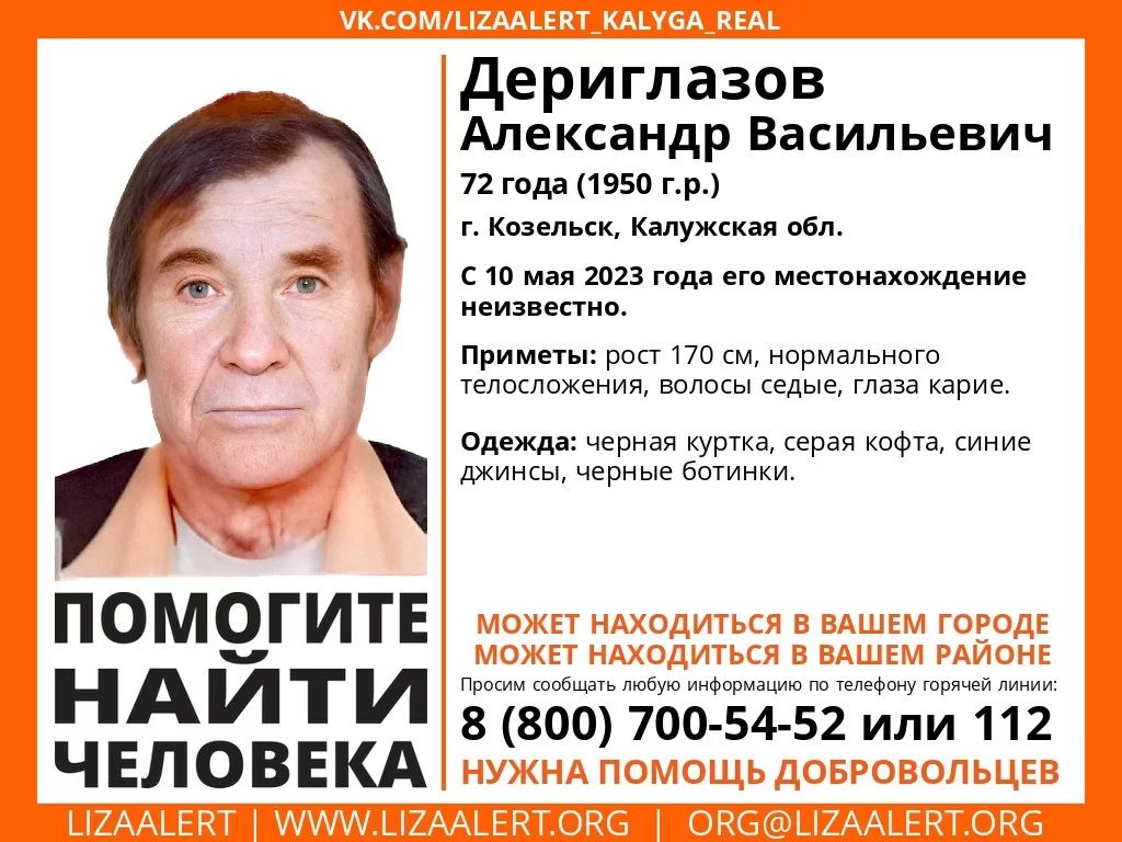 Пропавший может находиться в вашем городе или районе. Если вам известно что-то о местонахождении Александра Дериглазова, сообщите об этом по телефону горячей линии отряда 8(800)700-54-52 или 112.