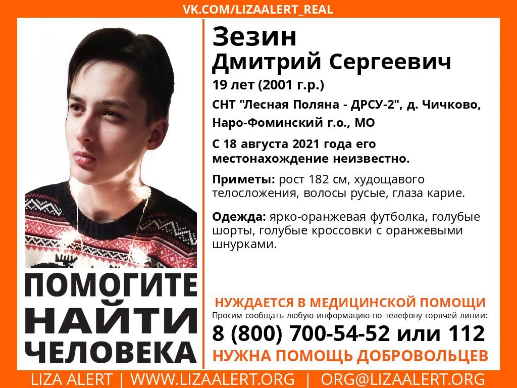 В «ЛизаАлерт» сообщили, что два дня назад в деревне Чичково Московской области пропал 19-летний парень Дмитрий Зезин. До сих пор о нем ничего неизвестно.