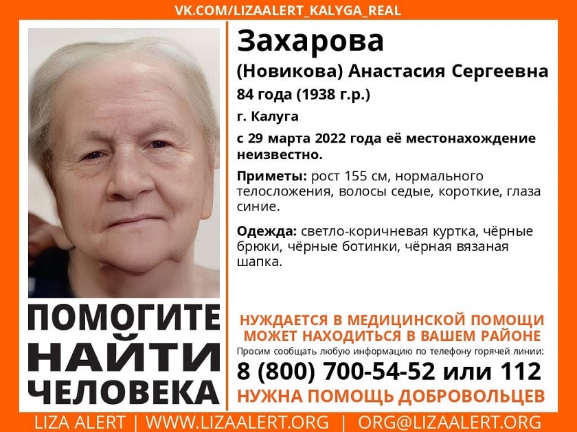 Любую информацию о местоположении калужанки отряд просит сообщать по телефону горячей линии 8-800-700-54-52 или инфоргу Инне по номеру 8-964-141-32-53.
