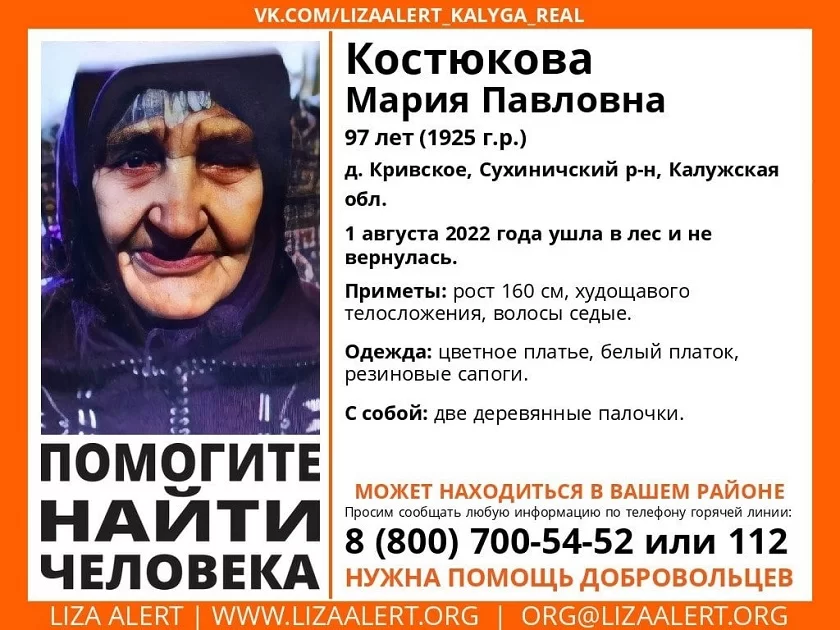 Поисково-спасательный отряд «ЛизаАлерт» просит калужан помочь в поисках пенсионерки. Мария Костюкова проживает в деревне Кривское Сухиничского района. Она не выходила на связь с 1 августа.