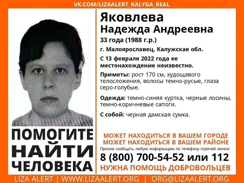 Всю информацию о местонахождении Надежды Яковлевой волонтеры просят сообщать по номеру горячей линии 8-800-700-54-52. Все звонки на территории страны осуществляются бесплатно.