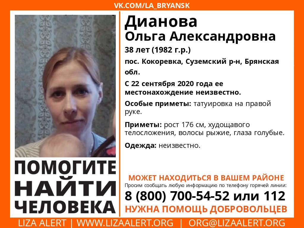 Ольга Александровна Дианова, 38 лет, пропала 22 сентября. Последнее место, где ее видели, - это место, где она жила: пос. Кокоревка Суземского района Брянской области. Два с половиной месяца нет никакой информации о местонахождении женщины.
