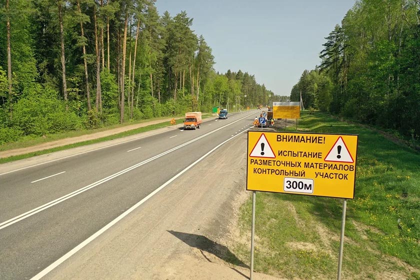 На 14 км этой дороги строители нанесли 46 поперечных контрольных линий. Все они нанесены материалами разных производителей и с использованием разных технологий: краски, термопластики, холодные пластики и штучные формы. Инициатором испытаний выступило управление автодороги «Москва – Бобруйск».