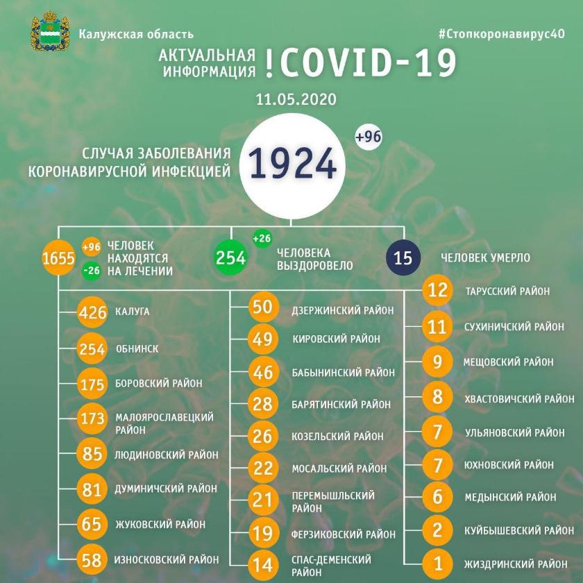 За сутки диагноз COVID-19 подтвердился еще у 96 калужан. На лечении в больницах и дома сейчас находятся 1655 жителей области, 254 пациентов врачи вылечили, 15 инфицированных умерли.