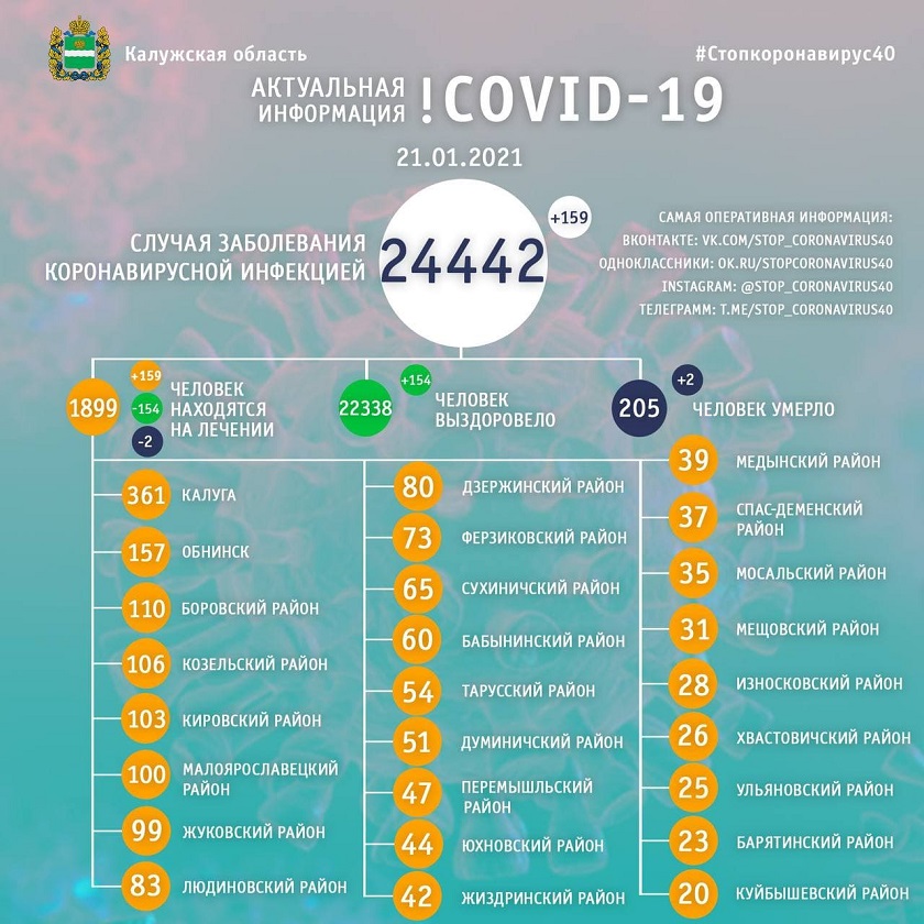 Умерло 205 человек. За сутки болезнь сразила еще двух человек: 84-летнего жителя Обнинска и 38-летнего жителя Жуковского района.