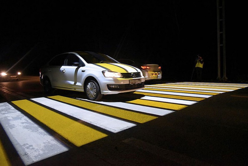 Проекционные переходы высвечивается на дороге с помощью проекторов с цветными фильтрами. В любую погоду такую разметку видно на дороге.