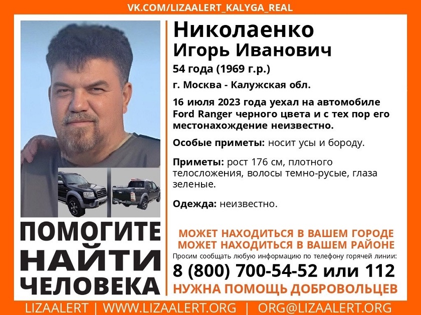 16 июля мужчина уехал на черном «Ford Ranger» и до сих пор не вышел на связь. В ориентировке поисково-спасательного отряда «ЛизаАлерт» указано, что пропавший ростом 176 сантиметров, плотного телосложения, с зелеными глазами и темно-русыми волосами. Из отличительных черт – усы и борода. Одежда, в которой Игорь Николаенко может быть – неизвестно.