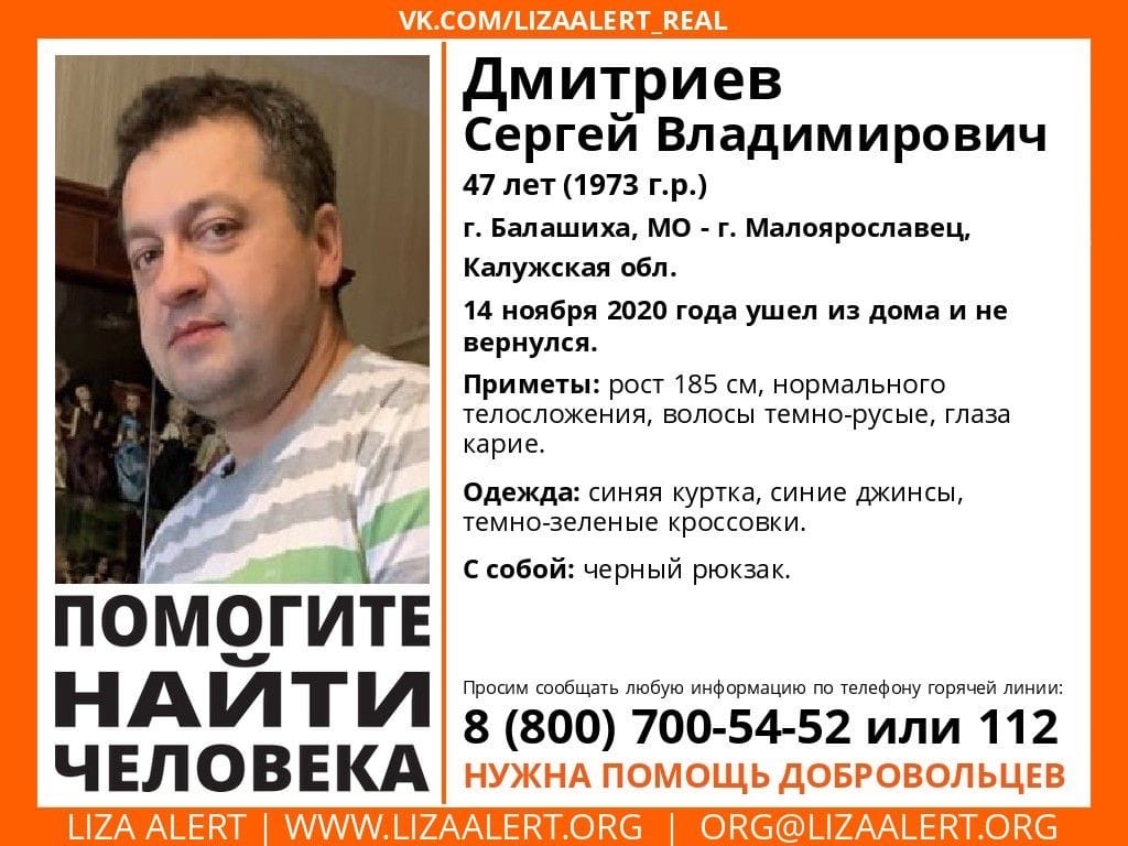 Речь идет о 47-летнем Сергее Дмитриеве, который пропал 14 ноября. По информации волонтеров, он может находиться в Малоярославецком районе Калужской области.