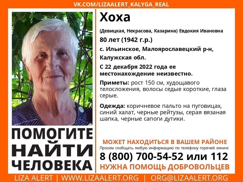Волонтеры написали, что потерялась Евдокия Хоха (Девицкая, Некрасова, Казаринова), жительница села Ильинское. Женщина ушла из дома накануне 22 декабря.