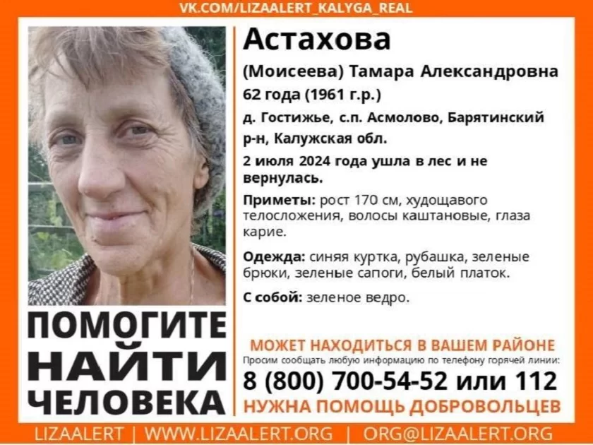 Женщина ушла в лес 2 июня и не вернулась. Пропавшая ростом 170 см, худощавого телосложения, с каштановыми волосами и карими глазами. Одета была в синюю куртку, рубашку, зелённые брюки и зелёные сапоги, на голове был белый платок. С собой у неё было зелёное ведро.