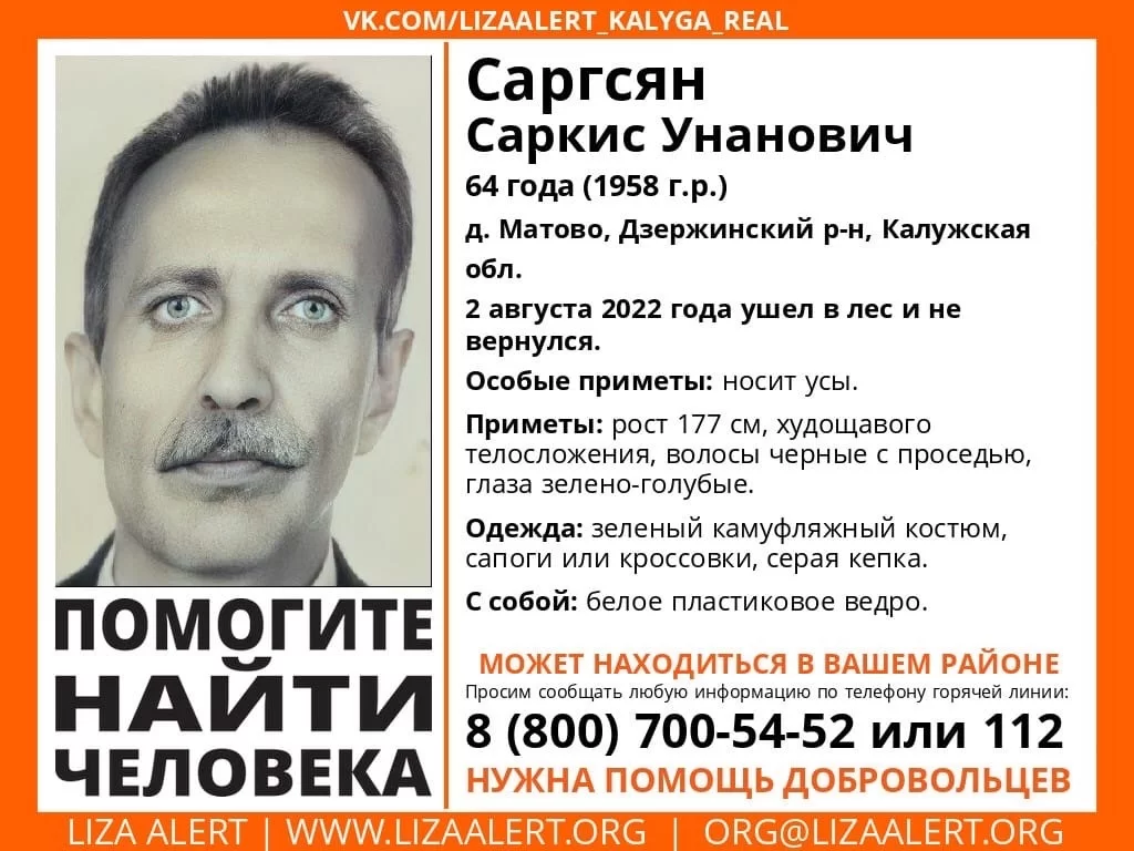Так, накануне, 2 августа, в лес за грибами ушел 64-летний Саркис Унанович Саргсян, житель деревни Матово в Дзержинском районе. О пропаже грибника сообщили волонтеры поисково-спасательного отряда «ЛизаАлерт».