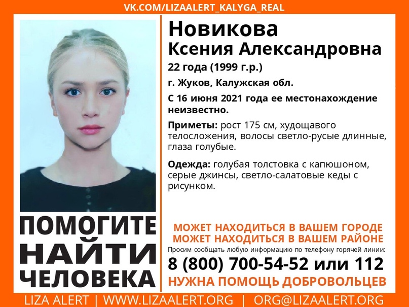 Ксения Новикова может находиться в вашем городе или районе! Любую информацию о местоположении девушки сообщайте по телефону горячей линии «Лизы Алерт»: 8-800-700-54-52.