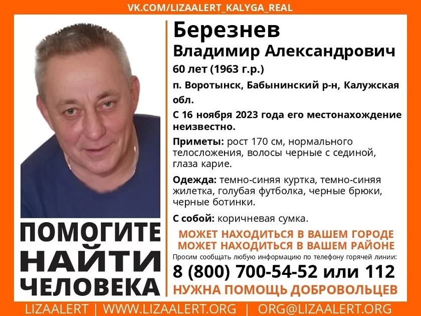 Из ориентировки добровольческого поисково-спасательного отряда «ЛизаАлерт» следует, что мужчина ростом около 170 сантиметров, нормального телосложения, кареглазый, волосы - черные с сединой. Одет пропавший в темно-синие куртку и жилетку, голубую футболку, черные брюки и такого же цвета ботинки. При себе имеет коричневую сумку.