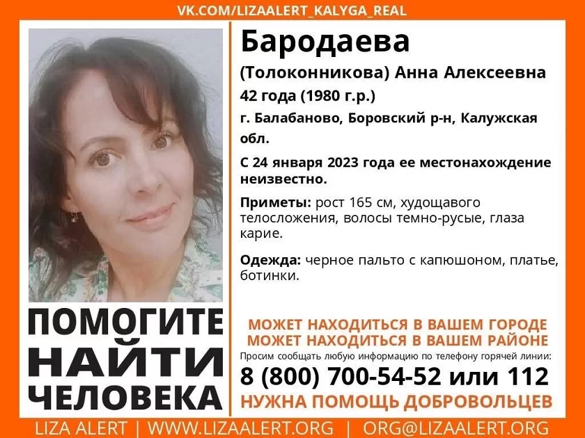 Пропавшая проживала в городе Балабаново Боровского района, однако на данный момент женщина может находиться в любой части Калужской области. Поисковики просят граждан о содействии – каждый. Кто видел Анну или знает о ее местонахождении, может обратиться по телефону 8-800-700-54-52.
