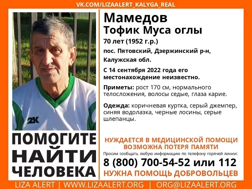 Тофик Муфаса оглы Мамедов проживает в посёлке Пятовский Дзержинского района. 14 сентября мужчина вышел из дома и не вернулся, с тех пор его местонахождение неизвестно.