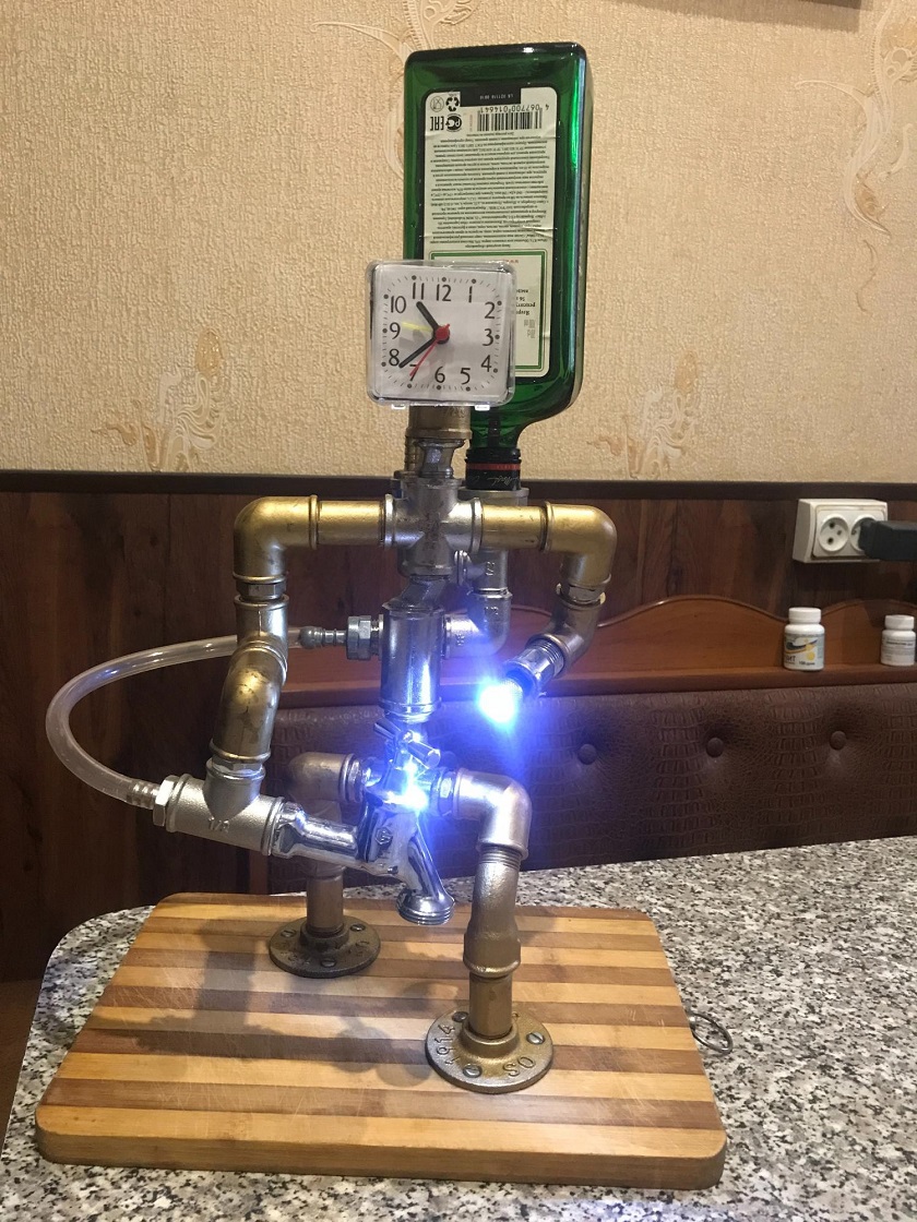 Житель Воротынска продает собственное изобретение – робота, созданного из водопроводных труб и деревянной разделочной доски. Его предназначение – разливать крепкие спиртные напитки с помощью краника и будильника, который возвышается над конструкцией. Для этого к «наливатору» вверх ногами прикручивается бутылка спиртного и содержимое по трубам наливается в рюмку.
