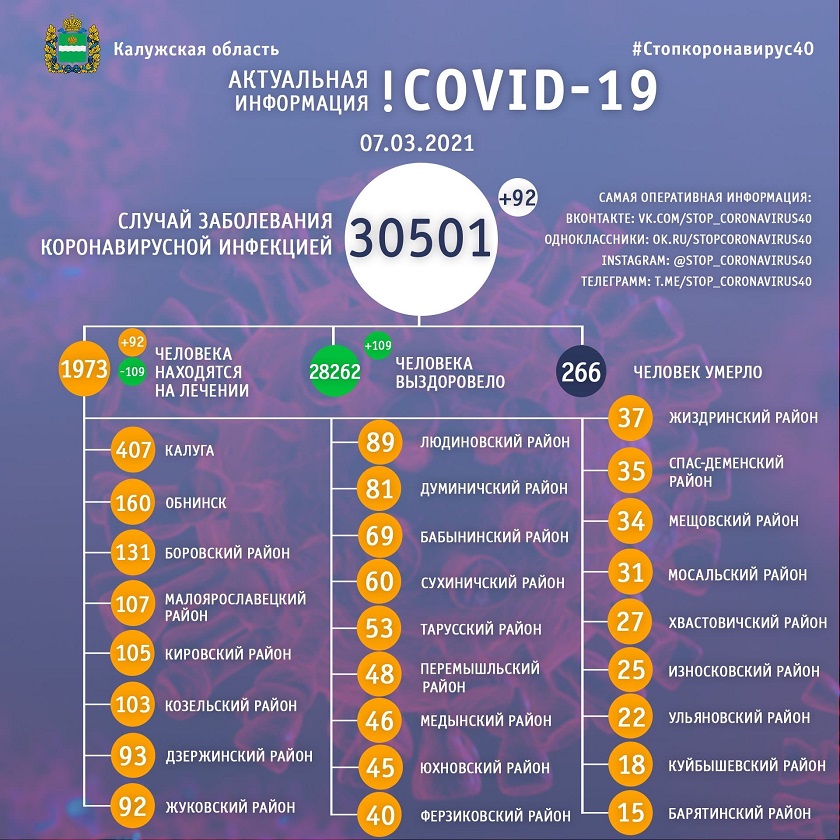 Число заболевших ковидом, с момента его появления в регионе, достигло 30 501. За последние сутки заболели 92 человека. Выздоровели за 24 часа 109 калужан. А за весь период коронавируса в Калужской области болезнь побороли 28 262 человека. Подтвержденных случаев смерти за сутки нет. Количество умерших составляет 266 человек.