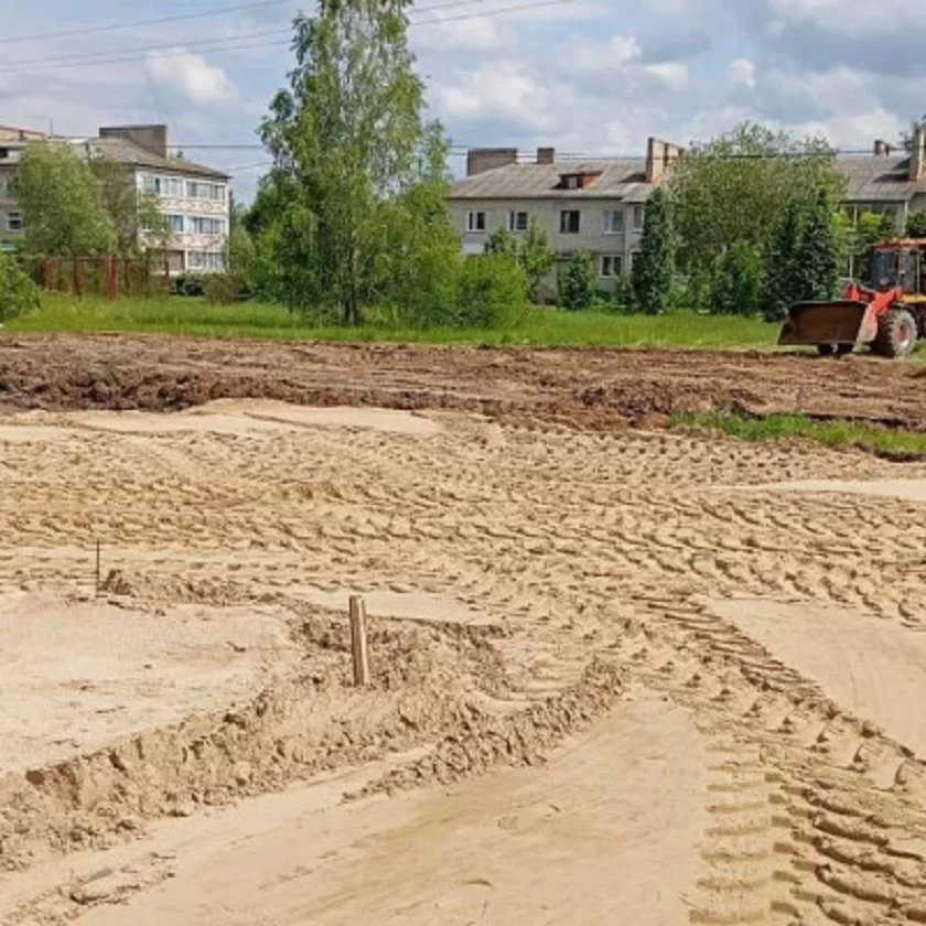 Сейчас на объекте проводятся активные земляные работы: подготавливается основание для тротуара, детской и спортивной площадок.
