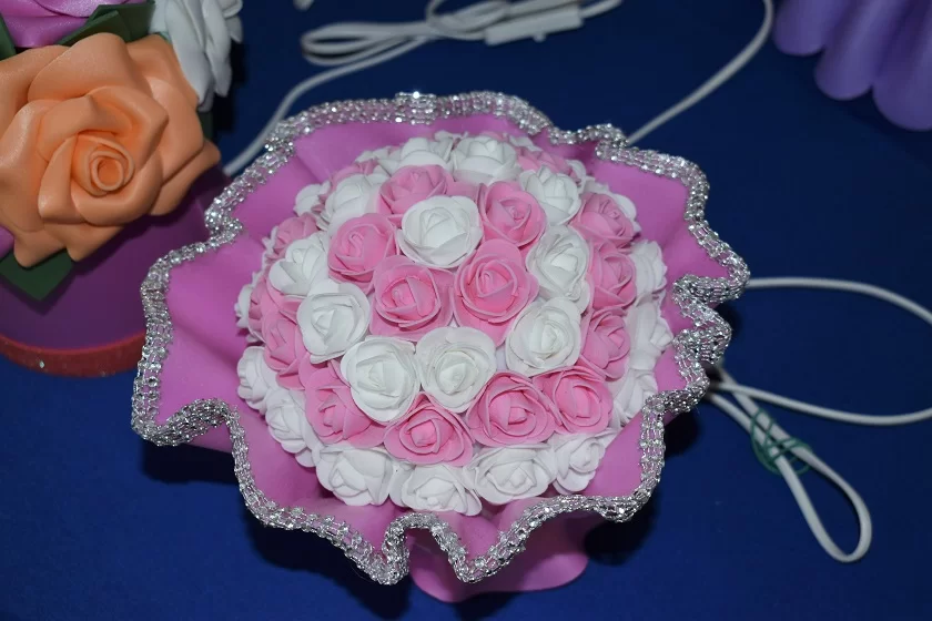 Автор выставки рассказала, что увлеклась искусством изготовления светильников четыре года назад, во время декретного отпуска. С тех пор её навыки в этом ремесле вышли на высокий уровень – Елена делает не только прикроватные лампы в виде букетов, кукол, животных и птиц, она научилась изготавливать и масштабные скульптурные композиции – её огромные букеты в половину человеческого роста не раз украшали сцену ДК «Юбилейный», где сейчас работает Елена. На выставке также был представлен торшер около двух метров в высоту с бутонами-светильниками.