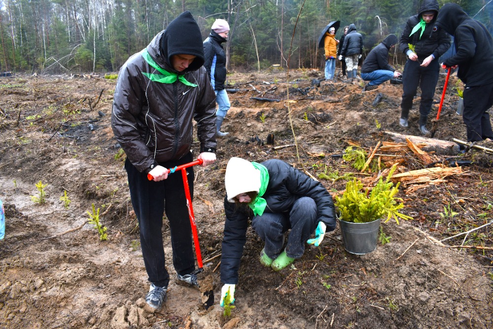 Специалисты объяснили школьникам, как производить посадку. Ребята пользовались специальными штыковыми лопатами, рыхлили землю, чтобы к корням саженцев поступало больше воздуха. Сажали молодые ели на расстоянии около 60 см.