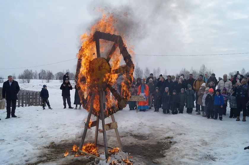 Хозяева гуляний решили отойти от стандарта со сжиганием чучела Масленицы. Здесь соорудили колесо, символизирующее солнечный круг Ярило, на который все присутствующие повязали ленточки, символизирующие несчастья, от которых хочется избавиться навсегда. Затем это колесо было сожжено, и в огне Ярила сгорели все несчастья.