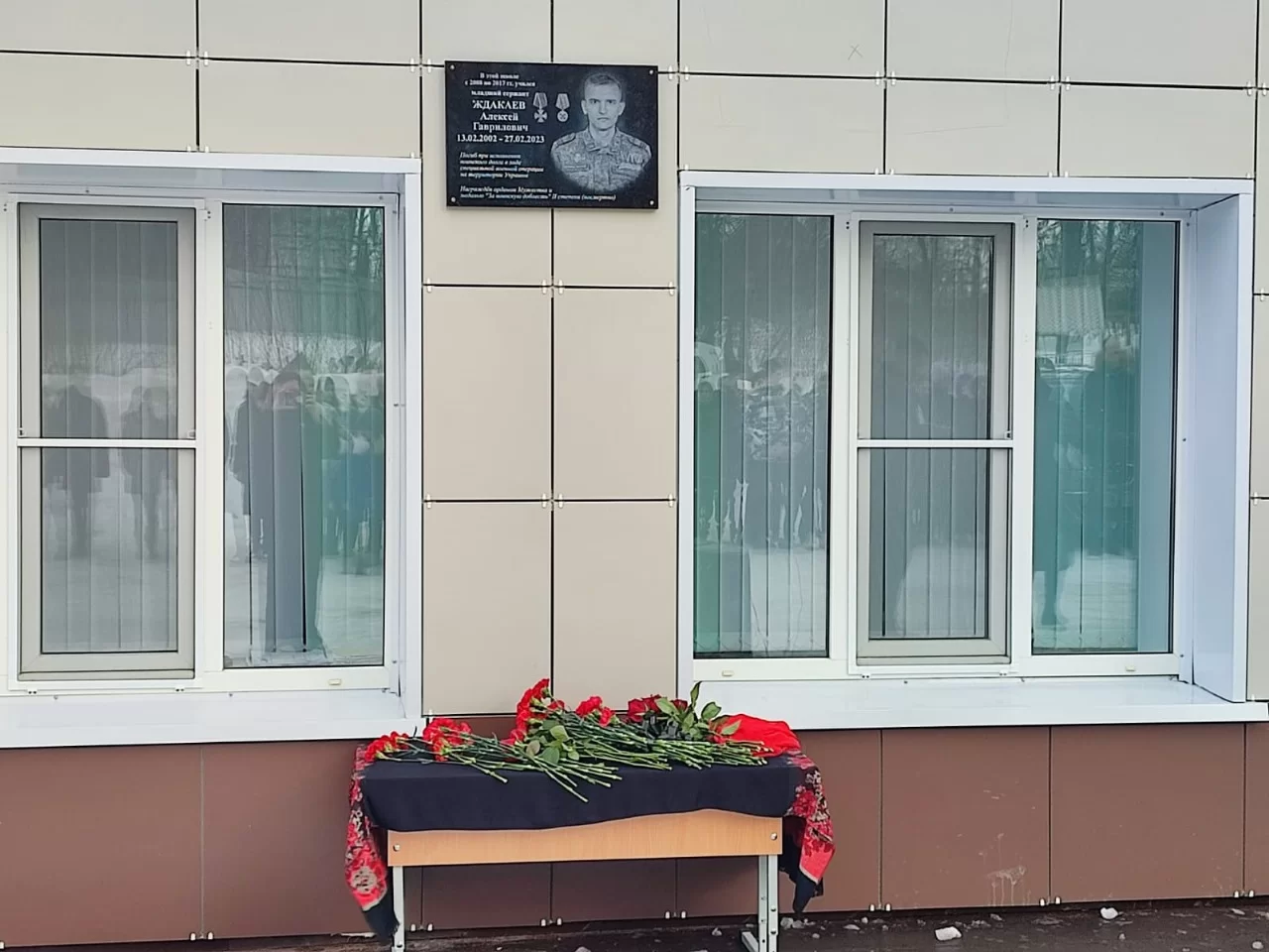 - сказал на торжественной церемонии глава администрации Малоярославецкого района Вячеслав Парфёнов.Право открыть мемориальную доску на фасаде школы было предоставлено родителям Алексея - Гавриле и Наталье Ждакаевым. Участники мероприятия почтили память героя Минутой молчания, возложили цветы к мемориальной доске. В школьном музее была установлена Парта Героя. Родители Алексея передали в него награды и форму сына.