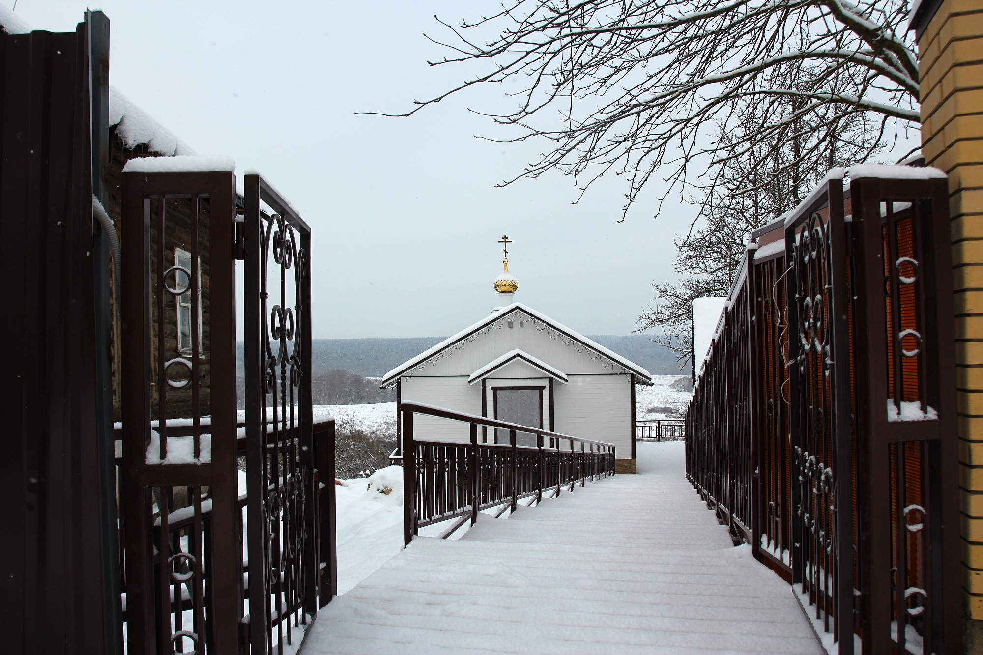 Место выбрано действительно удачное, подъехать на машине можно без особых затруднений. Купель разместили в красивом одноэтажном здании, крышу которого венчает золоченая маковка с православным крестом.