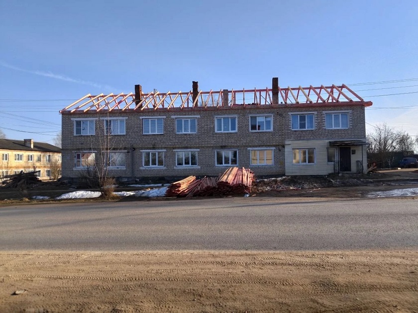 На сегодня выполнены демонтажные работы, основание крыши покрыто влагоизолирующим материалом, ведется установка стропильной системы. Срок исполнения работ по контракту – 1 июня.