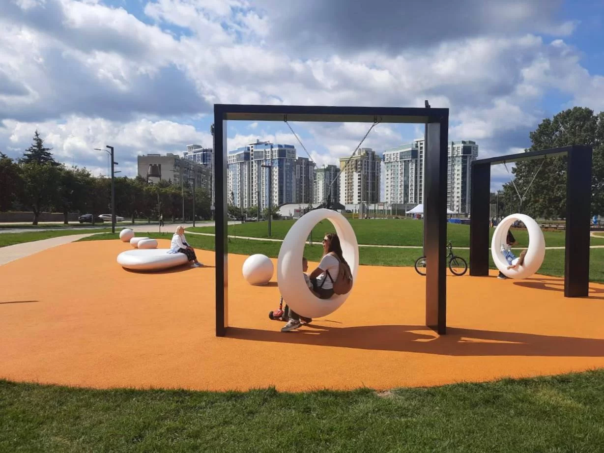 В Обнинске вокруг дуба на площади перед Домом ученых установили большую круговую скамейку. Также появились и другие элементы благоустройства – скамейки в виде камней, качели и арт-объекты.
