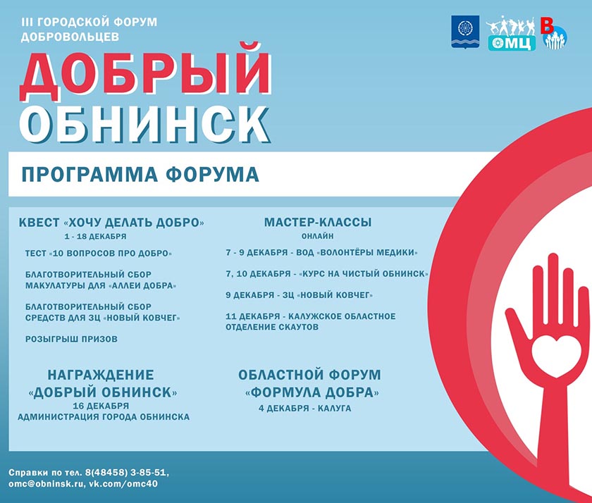 В рамках форума пройдут прямые эфиры Всероссийского общественного движения «Волонтёры-медики» и активистов движения «Курс на чистый Обнинск», состоится прямой эфир с руководителем зоозащитного центра «Новый ковчег». Участников ждет мастер-класс от региональной организации скаутов.