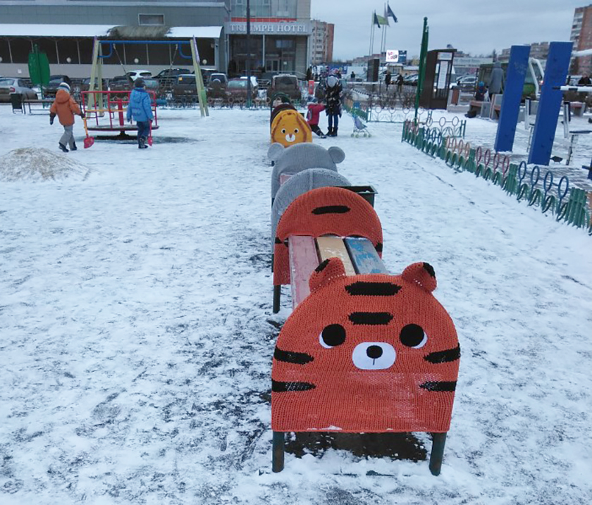 Пользователи соцсетей рассказали, что в Обнинске в районе торгового центра «Плаза» несколько лавок «укутали» в вязаные чехлы. Они сделаны в виде мультяшных животных.