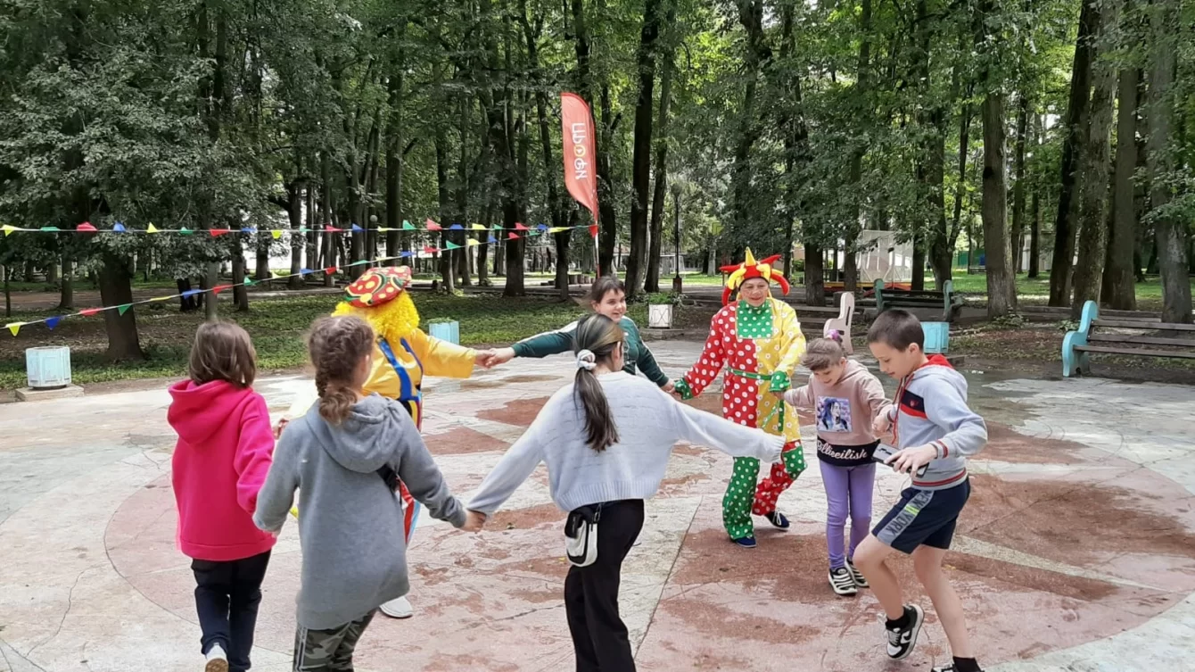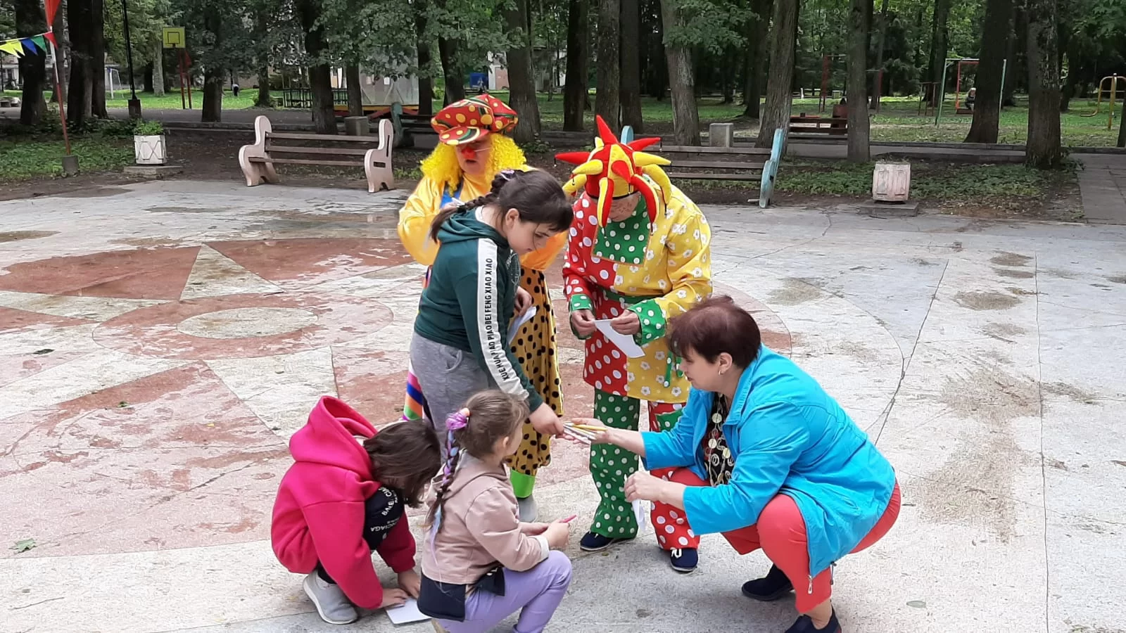Артисты провели игровую программу «Встреча с Клёпой и Стёпой». Ребята вместе с клоунами представили себя конструкторами-испытателями, сделав самолетики и запустив их в дальний полёт. Дети разгадывали загадки и шарады от Клёпы и Стёпы. Весело плясали под музыку флешмоба «Пчелы» и «Путешествие».