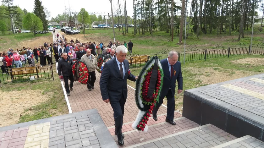 Затем жители района почтили память павших земляков минутой молчания, после чего возложили к памятнику венки и цветы.