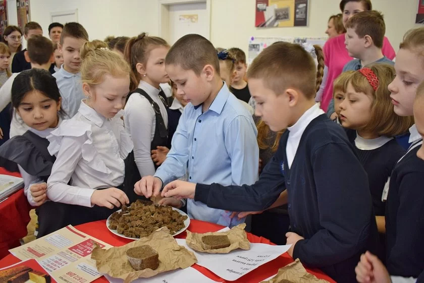 Дети ещё раз услышали историю великого подвига и силы духа ленинградцев. Попробовали на вкус блокадный хлеб, состоящий в то время из обойной муки, жмыха, солода и всего, что пригодно для еды. Хлеб, по рецепту близкий к ленинградскому, специально к памятной дате каждый год печёт тарусянка Нина Викол. Увидели, как постепенно уменьшалась норма его выдачи.