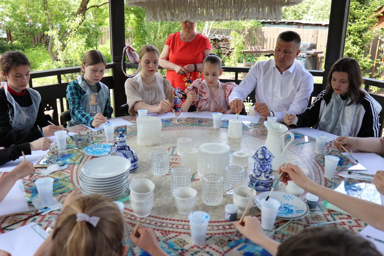 Вместе с ребятами технику гжели освоил глава администрации Тарусского района Михаил Голубев. Работали в саду, в уютной беседке. Гжельская керамика, как русский промысел существует уже 7 веков. Дети узнали историю легендарной гжели, расписали чашки и блюдца в технике мазковой росписи. Руководили процессом художники-специалисты.