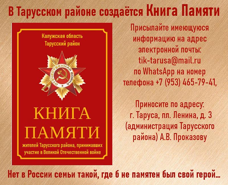 Инициативная группа, состоящая из представителей поискового движения Тарусского района, обращается ко всем с просьбой принести или прислать фотографии, письма, документы военной поры, истории о родственниках-тарусянах и жителях Тарусского района – участниках ВОВ. Информацию можно направить по электронной почте tik-tarusa@mail.ru, по WhatsApp на номер телефона: +7 (953) 465-79-41, по адресу: г. Таруса, пл. Ленина, д. 3 (администрация Тарусского района) А.В. Проказов.