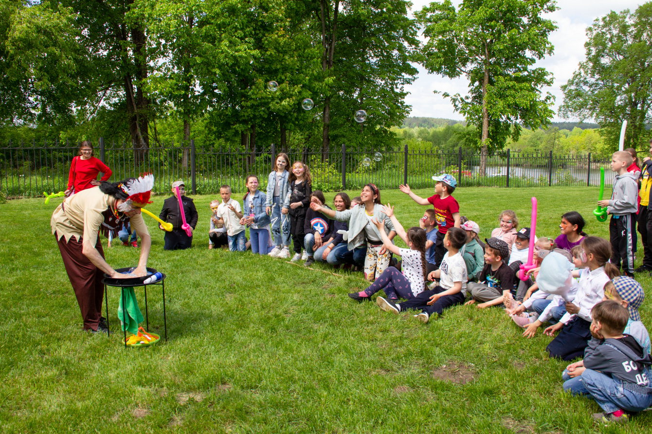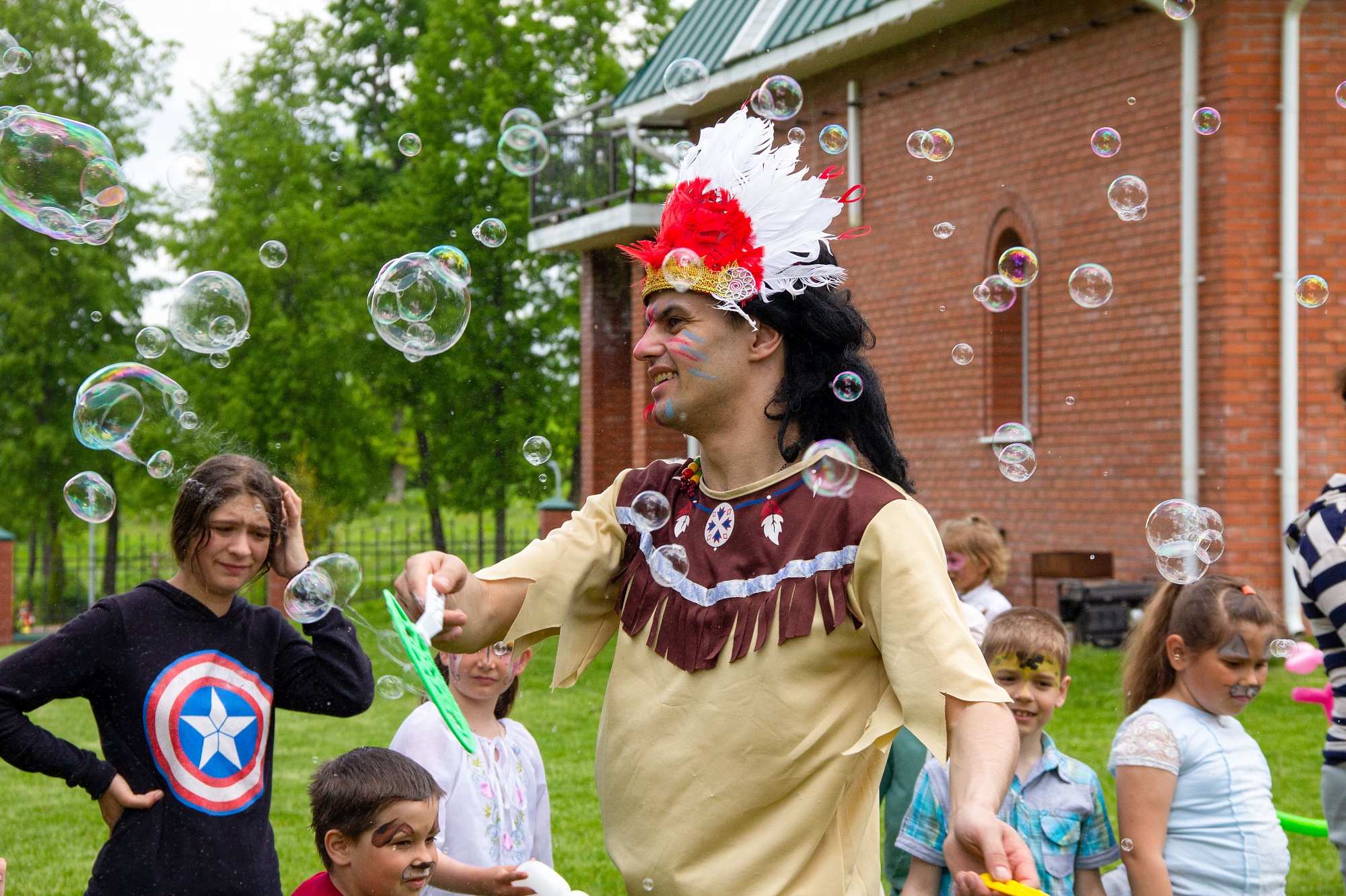 Большую веселую компанию на протяжении почти трех часов развлекали аниматоры из Брянска. Три веселых индейца подготовили для ребят интересную и насыщенную программу с зажигательной музыкой, песнями, танцами, мыльными пузырями и воздушными шарами. Все дети с огромным удовольствием принимали участие в подвижных играх, шуточных конкурсах и занимательных викторинах, качались на качелях, катались с горки, бегали по территории храма и просто от души веселились.