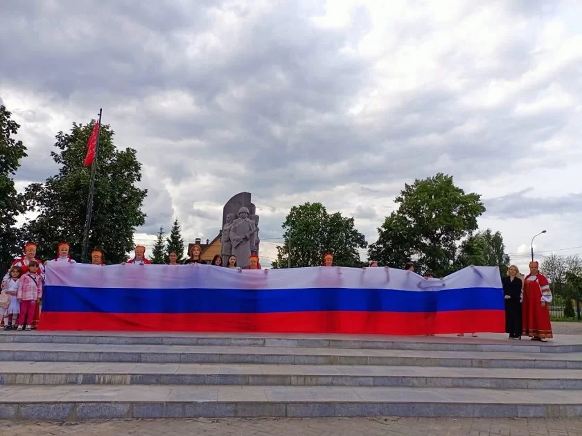 В Белоусово праздничная колонна с огромным триколором прошла по центральной улице Гурьянова. Концертная программа началась с торжественного исполнения гимна России народным хором «Белоусовские зори».