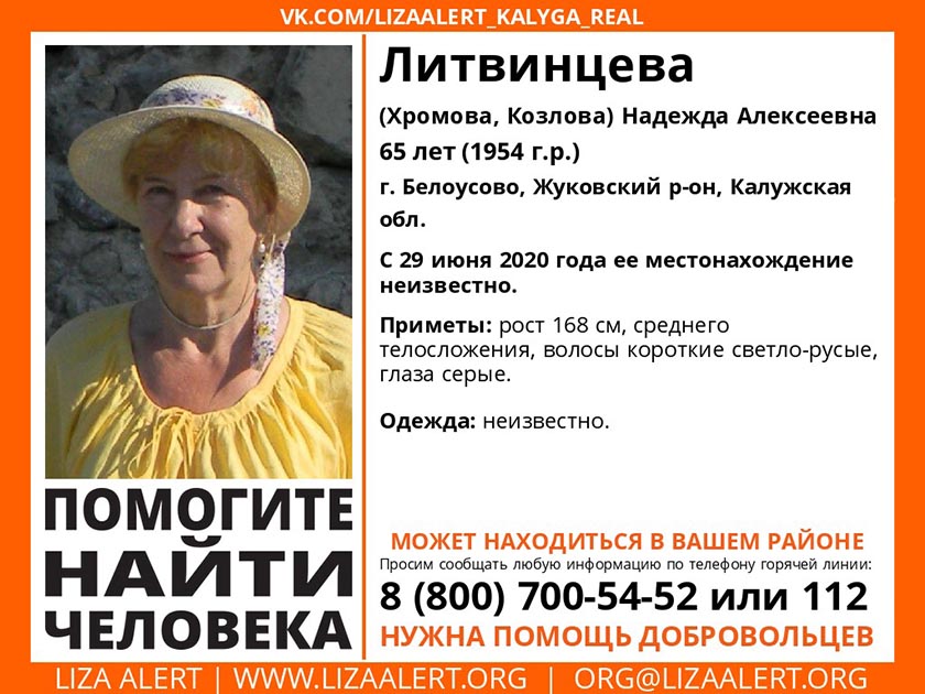 Активисты отряда «Лиза Алерт» просят помочь в поиске 65-летней жительницы Белоусова.