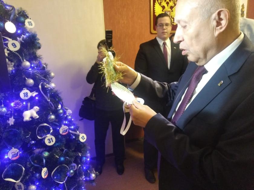 Парламентарии снимали с ёлки шары с цифрами, и так узнавали чье желание им предстоит исполнить. Так руководитель фракции "Единая Россия" Виктор Бабурин подарит юной калужанке домру, о которой она давно мечтала.