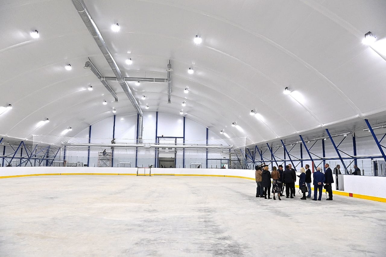 Игорь Феденков проинформировал гостей о ходе строительства. По его словам, работы выполнены на 90 процентов, 20 октября начнется заливка льда, с 30 октября ледовая арена начнет работу.