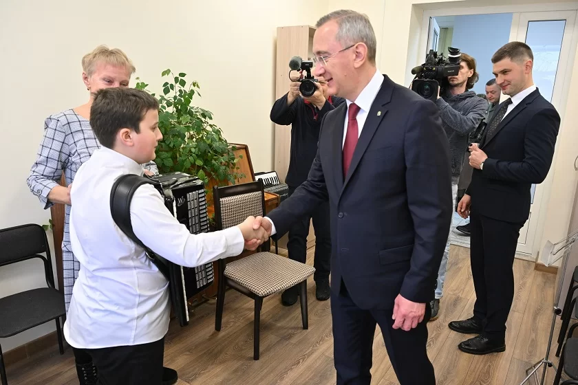 Глава региона также посетил Детскую школу искусств в Людиново. Он пообщался с ее воспитанниками и педагогами. В 2023 году в рамках национального проекта «Культура» с февраля здесь вёлся капитальный ремонт учебного корпуса. 1 сентября состоялось его открытие. Корпус обновили полностью: кровлю, фасад, внутреннюю отделку и инженерные коммуникации.