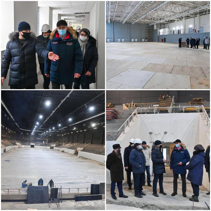 Он рассказал о выполненных строительных работах в будущем учреждении спорта, в том числе в корпусе для временного размещения спортсменов, о ближайших планах по укладке паркета в универсальном игровом, отделке зон выхода спортсменов в ледовой арене и предстоящей заливке здесь льда.