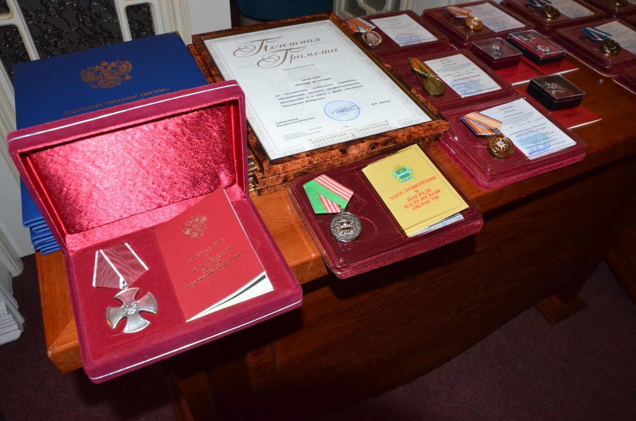 Группа сотрудников и ветеранов ГУ МЧС России по Калужской области была отмечена благодарственными письмами Президента России, областными и ведомственными наградами за заслуги в выполнении задач по предупреждению и ликвидации чрезвычайных ситуаций в регионе.