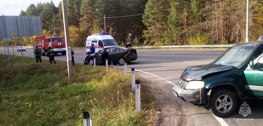 У легковушки повреждена передняя часть: помят капот и крылья, разбит бампер и фары. У японского внедорожника похожие повреждения, а также помята правая задняя дверь, это можно увидеть по фото, которое предоставила пресс-служба ГУ МЧС России по Калужской области.