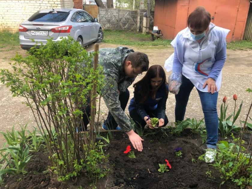 В преддверии юбилея Победы волонтеры благоустраивают территории возле домов ветеранов и сажают цветы.