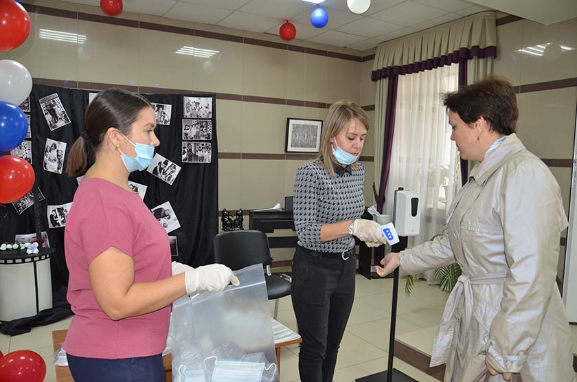 В реалиях этого года на всех избирательных участках соблюдаются строгие санитарно-эпидемиологические меры: на входах бесконтактным способом измеряют температуру человека, а после дезинфекции рук выдают пакет с одноразовой медицинской маской, перчатками, шариковой ручкой. В самих помещениях люди соблюдают социальную дистанцию.