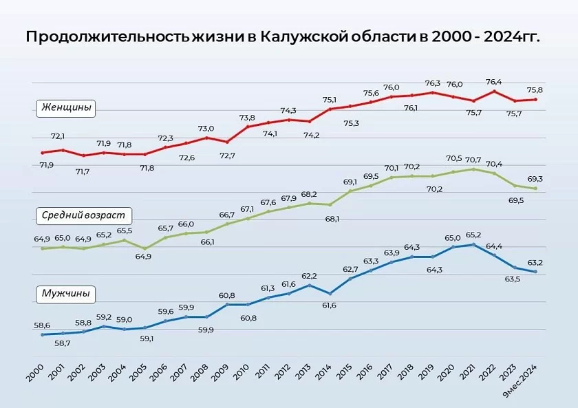 При этом, по данным регионального минздрава, ожидаемая продолжительность жизни с 2021 года выросла на 3,2 года – с 69,78 до 73,04 лет. С 2014 года минимальный показатель среднего возраста не падает ниже 68 лет. Кроме того, в 2023 году в Калужской области количество умерших сократилось на целых 4,2 процента.
