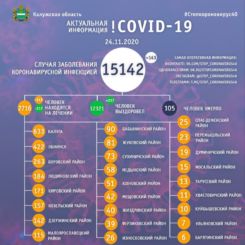 Количество заболевших COVID-19 за весь его период в нашем регионе составляет 15 142 человека на момент 24 ноября. Из них 143 заболевших за последние сутки